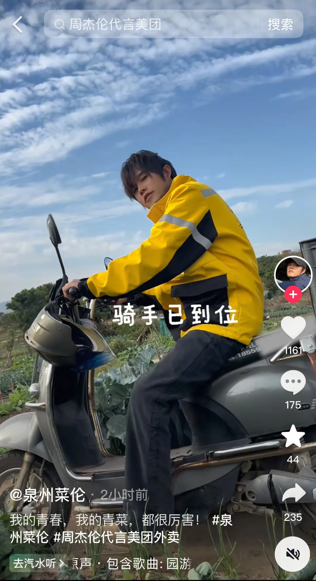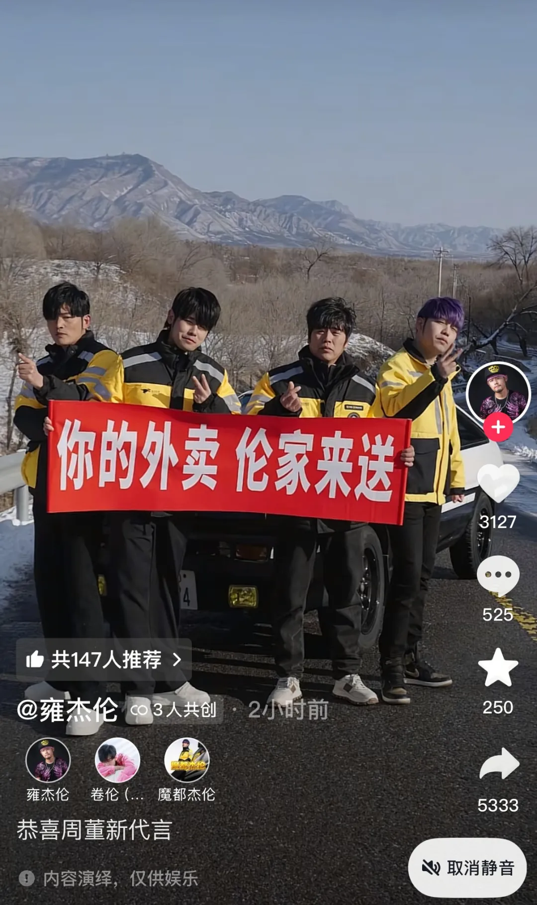 四位长得很像周杰伦的网络红人@魔都杰伦 、@雍杰伦 、@卷伦(华安凯)和@粥饼伦 穿着美团外卖骑手服,做着招牌动作,恭喜周董新代言。