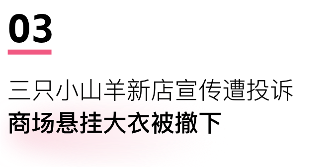本周,位于上海南京西路的久光百货内,服装品牌三只小山羊为宣传新店开业,在商场中庭悬挂巨幅代言人海报,并悬吊多件长短不一的驼色大衣。有网友发帖吐槽“看起来像阿飘”,“吓人”,“好像一群无头尸体在天上飘”。