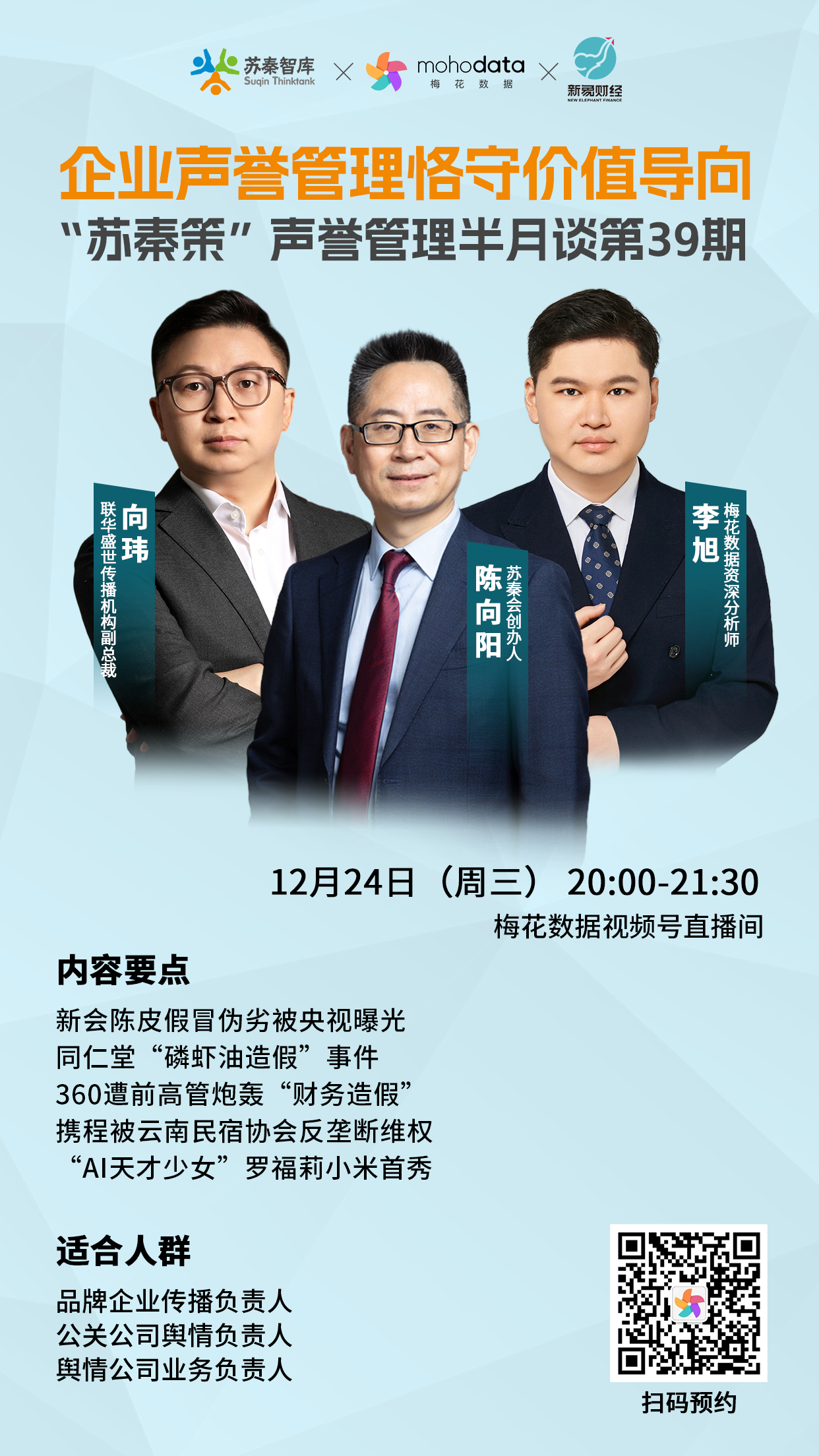新的一周开始,本周三梅花数据将携手苏秦智库举办第39期声誉管理半月谈直播,重点分析同仁堂“磷虾油造假”事件与“AI天才少女”罗福莉小米首秀事件,欢迎感兴趣的朋友扫描文末海报二维码预约直播。