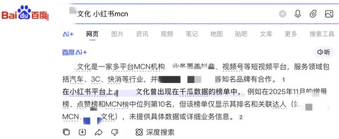 **文化是一家多平台MCN机构,业务覆盖抖音、视频号等短视频平台,服务领域包括汽车、3C、快消等行业,与***、***知名品牌有合作。 在小红书平台上,文**文化曾出现在千瓜数据的榜单中,例如在2025年11月的增量榜、点赞榜和MCN榜中位列第10名。
