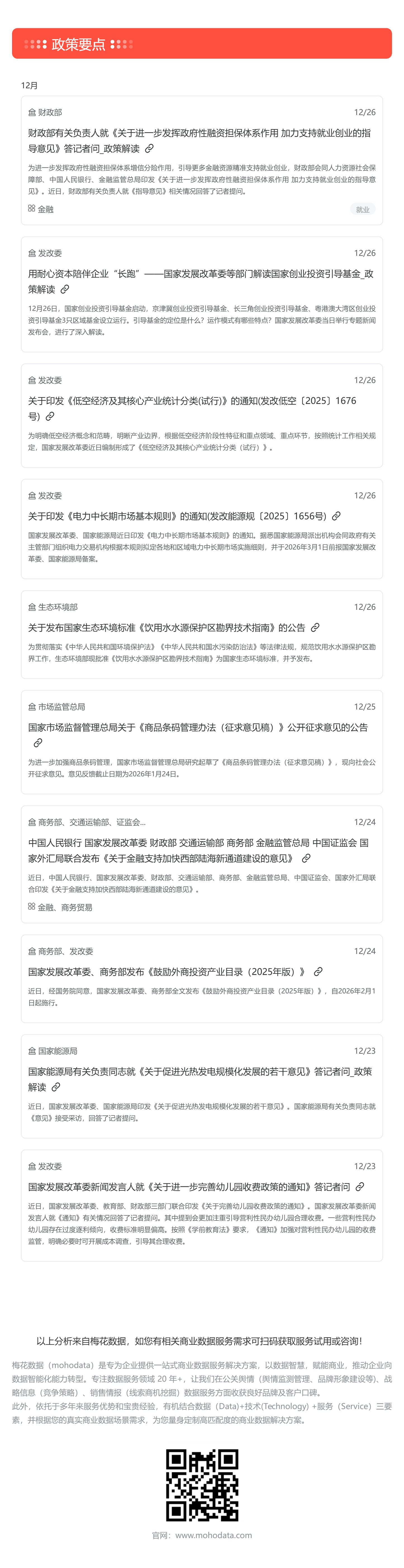 根据梅花数据舆情监测要政盘点统计,监测期间共收录重要政策信息共计109条,其中涉及金融、能源、外贸等多个领域,建议重点关注《鼓励外商投资产业目录(2025年版)》、《商品条码管理办法(征求意见稿)》等政策。