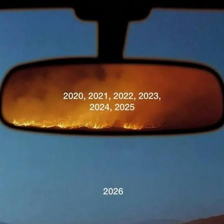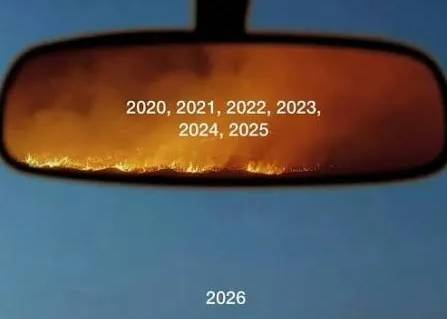 2025 年走到尾声时,一张图在互联网上被反复转发。画面里,一辆车正行驶在公路上,后视镜里,2020至2025的篇章如一片燃烧的荒原,火光映照着全球性的暂停、重启与无数个体的迷茫。当我们终于将目光转向前方,2026的道路在晨曦中展开。