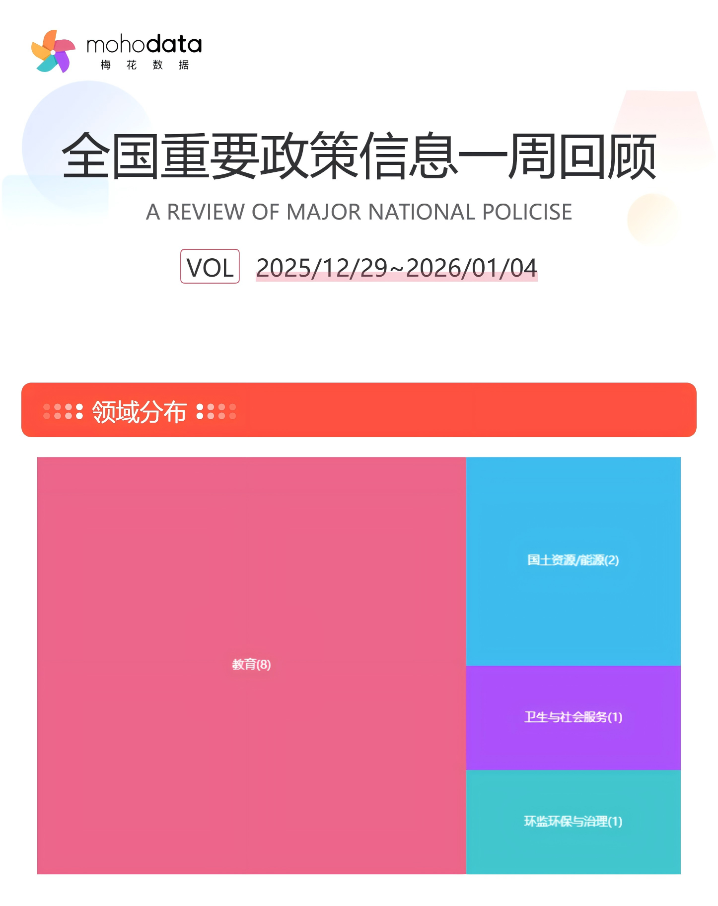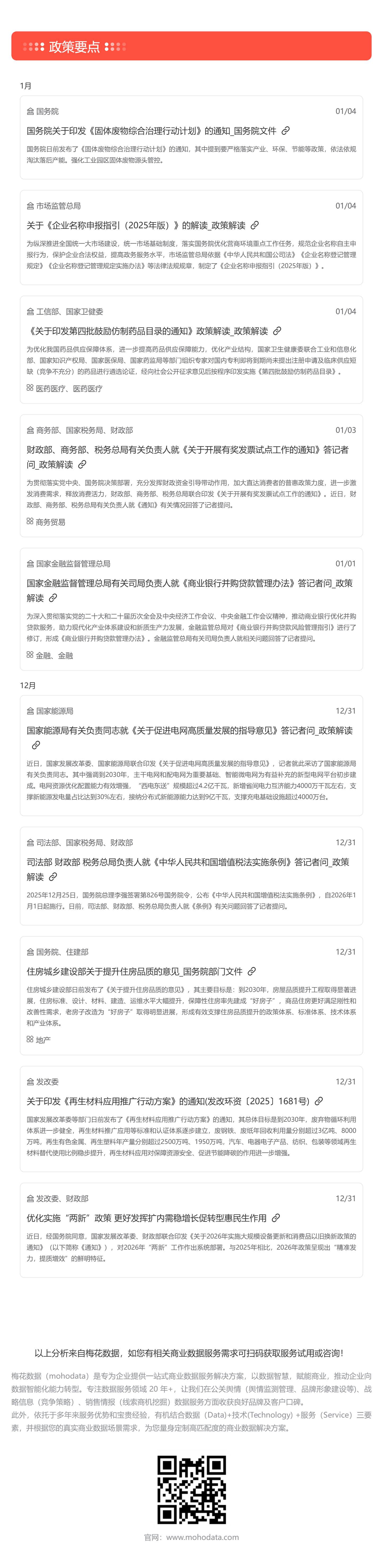 根据梅花数据舆情监测要政盘点统计,监测期间共收录重要政策信息共计143条,其中涉及医疗、环保、金融、房产等多个领域,建议重点关注《中华人民共和国增值税法实施条例》、《商业银行并购贷款风险管理指引》等政策。