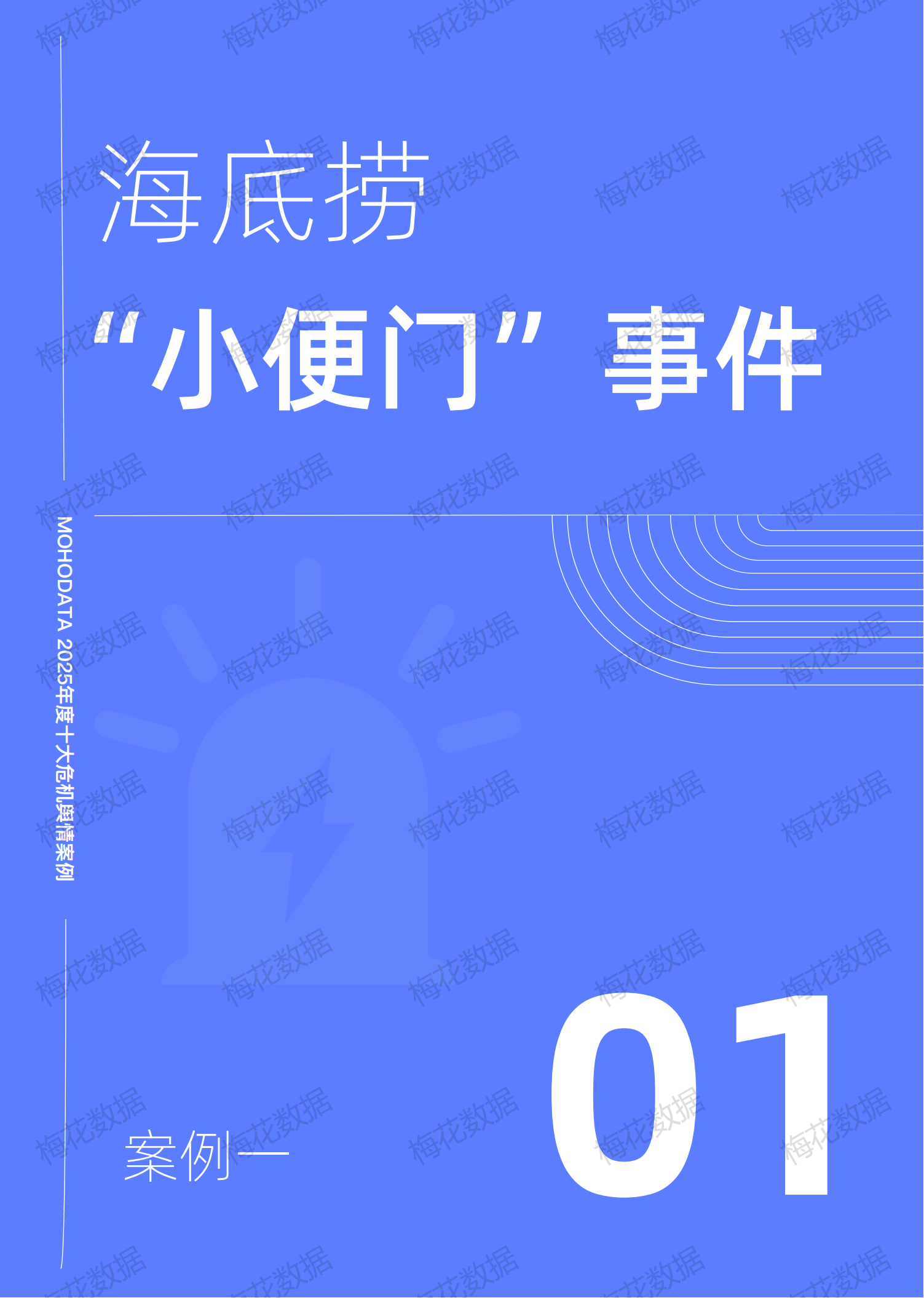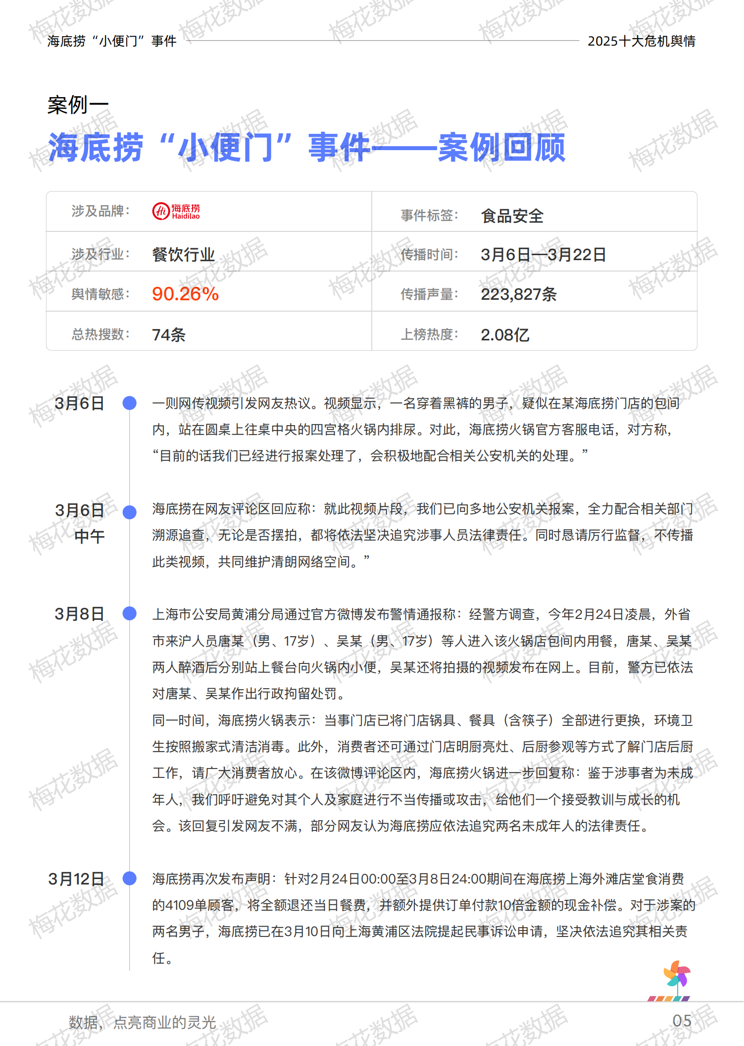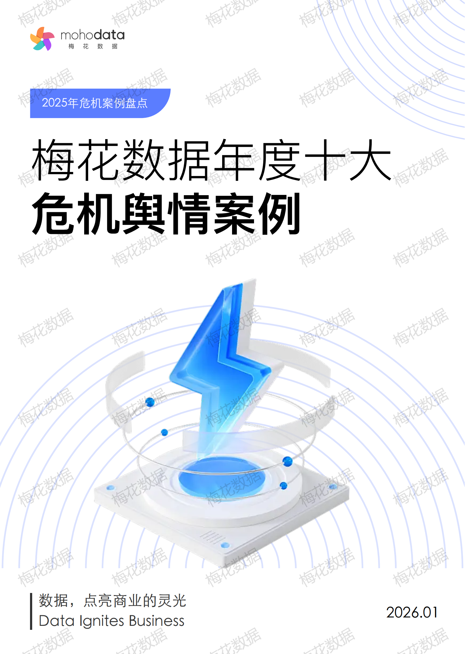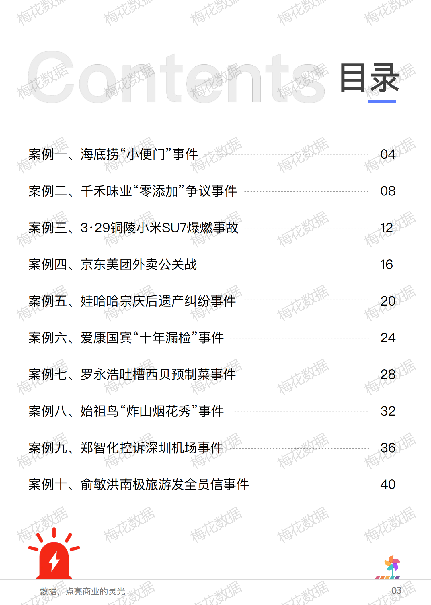 梅花数据根据传播影响⼒、公众反馈、案例典型、⾏业代表等多个维度筛选整理出年度⼗⼤品牌危机舆情案例。事件类型上包括意外事故、⾼管翻⻋、公共事件、内部管理、用户维权、争议话题等等,供⼴⼤公关从业者参考。