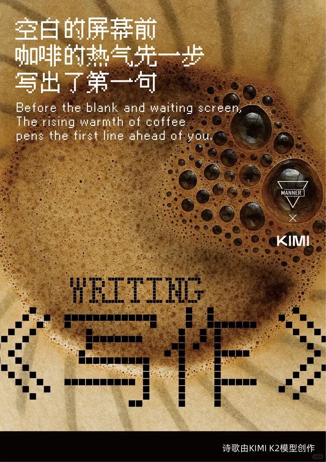 去年11月底,Manner官宣跨界合作Kimi AI,带来联名饮品“厚芝芝拿铁”和手机支架周边。值得关注的是,联名活动正大光明地用上了AI写的文案——Kimi AI最新K2 Thinking模型生成的“三行咖啡诗”。