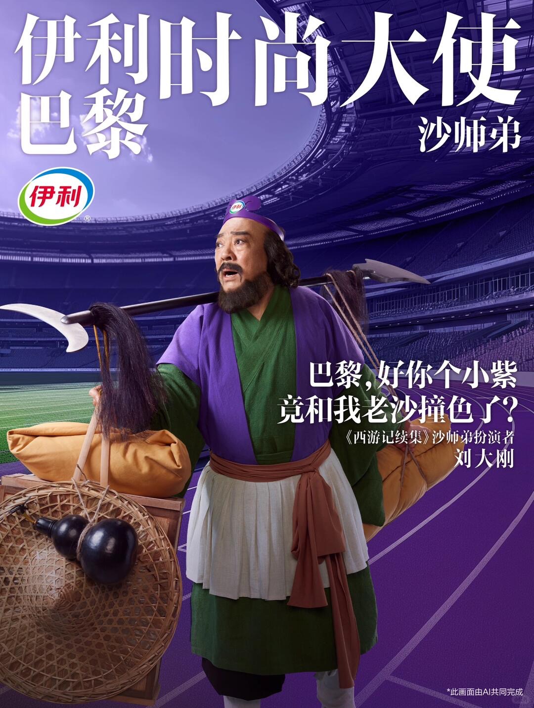 伊利迅速行动,邀请“沙僧”扮演者刘大刚担任品牌大使,并借助AI制作创意平面。品牌模仿时尚芭莎的杂志封面,让演员刘大刚化身沙师弟接梗,认证“伊利巴黎时尚大使”称号,以“紫定行”谐音“指定行”,预祝中国健儿在奥运会上取得佳绩。