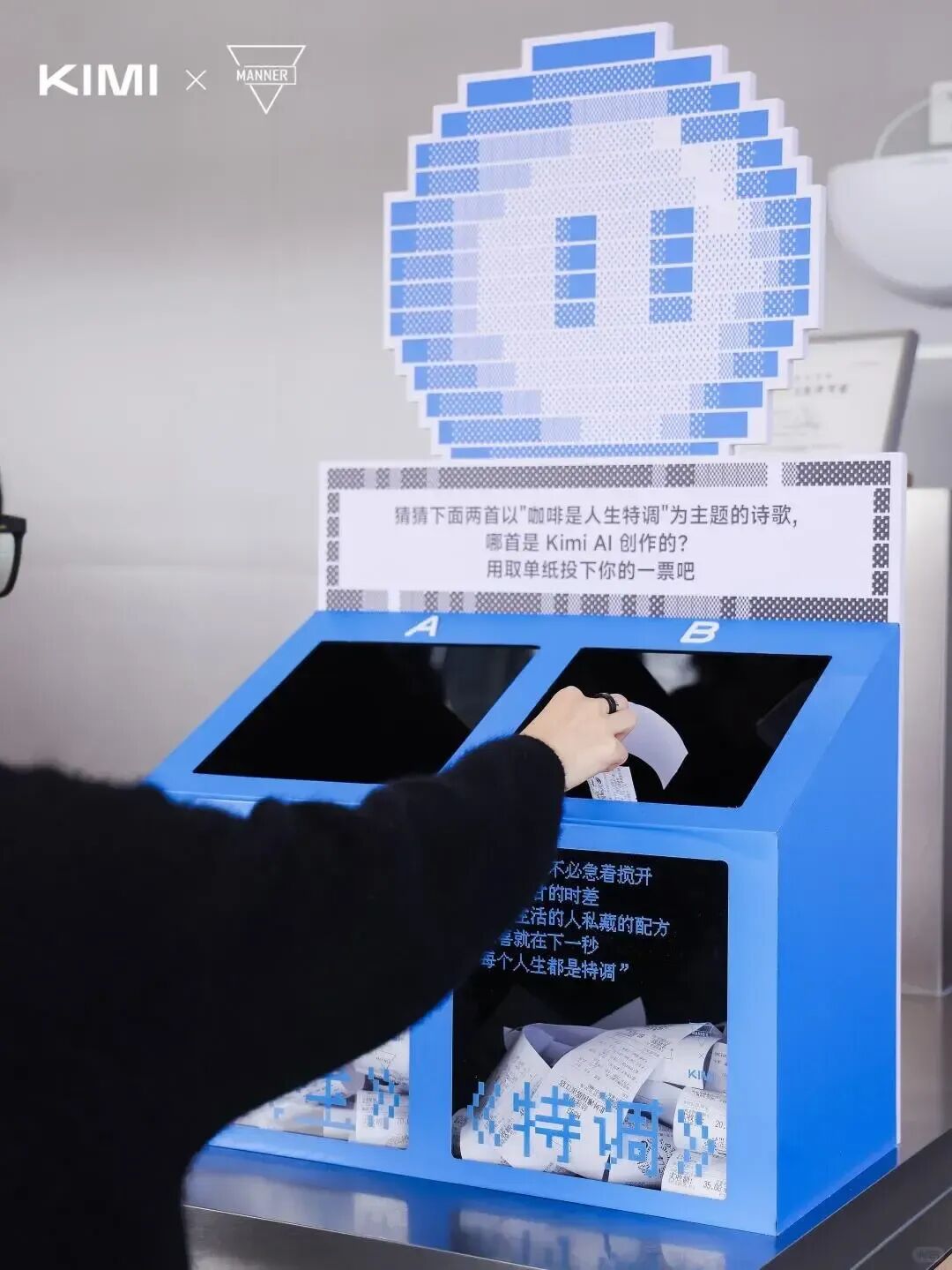 其中几首更是展示在位于上海滨江的Manner咖啡联名主题店中。这既是向各位职场人士宣传Kimi AI大模型,推荐在工作中使用,也是生文AI大模型的一次创意广告实践。