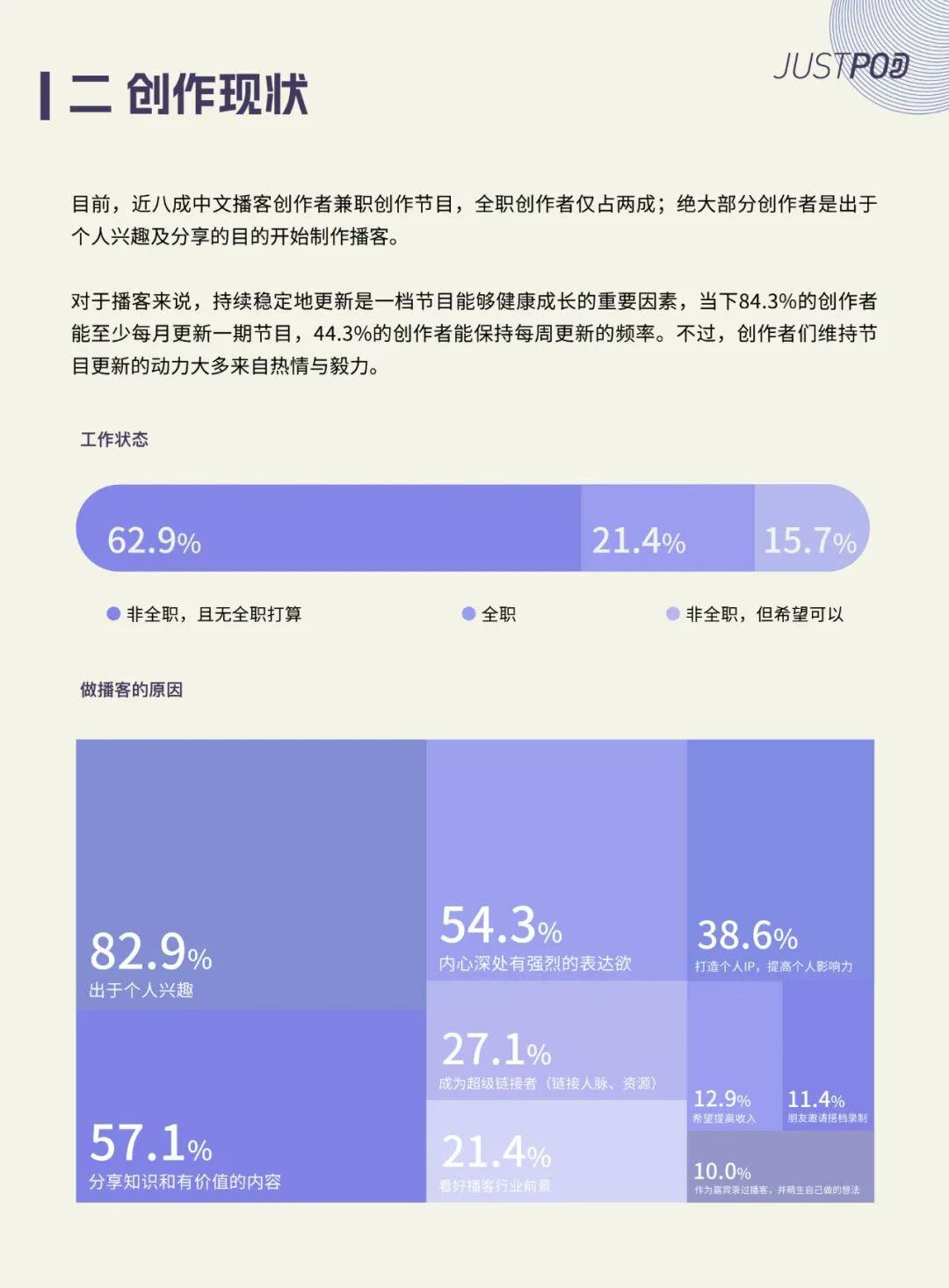 Justpod发布的《2024中文播客新观察》曾提到,中文播客创作者中有近八成都是兼职创作节目,维持节目更新的动力大多来自热情与毅力,对待商业变现相对佛系。比起赚钱,这些创作者更需要满足自己的表达欲,在碎片化、短视频时代,留下经得起时间沉淀的内容。