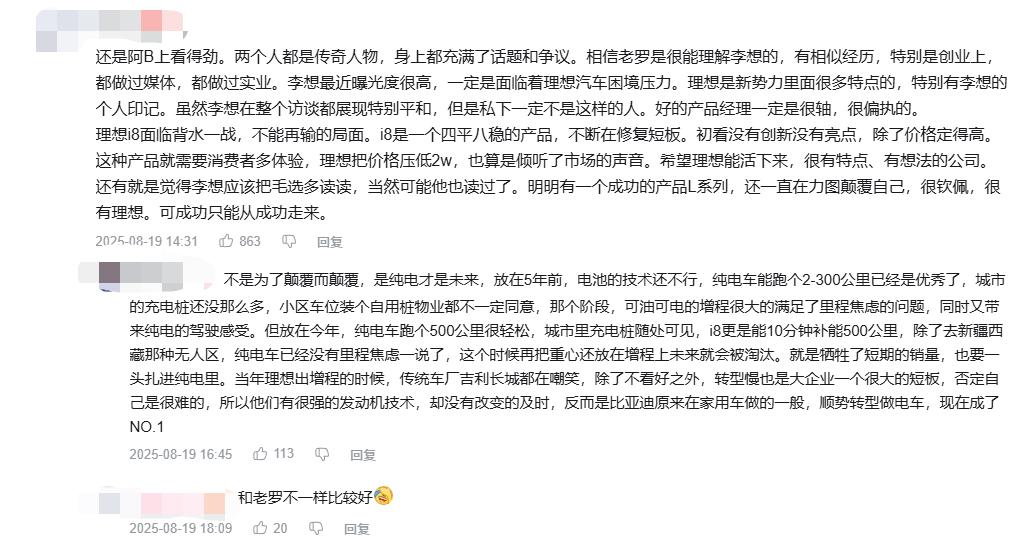 在李想与罗永浩对谈的那期节目评论区,不少用户表示对李想和理想汽车公司有了新的认识,觉得这家公司“有特点、有想法”。上完罗永浩的节目后,李想顺势入驻B站,聊自己对数码产品的理解,也展示健身成果,与用户拉近距离的同时,也让理想汽车多了份商业标签之外的温度。