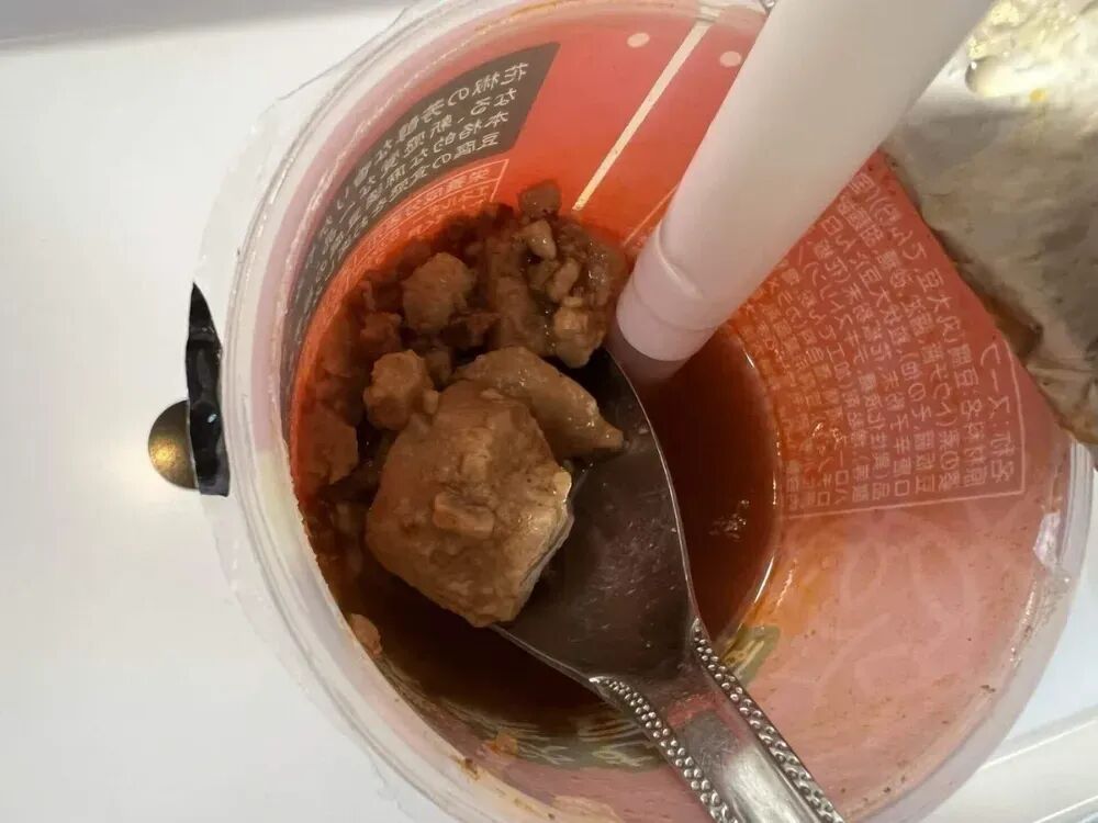 另外,或许是想让消费者更顺利地吸出“麻婆豆腐”,罗森还贴心地配上了一根粗吸管。但有消费者打开后发现,里面的豆腐块竟然还是完整的,体积还不小,最后还是不得不拿出勺子来。