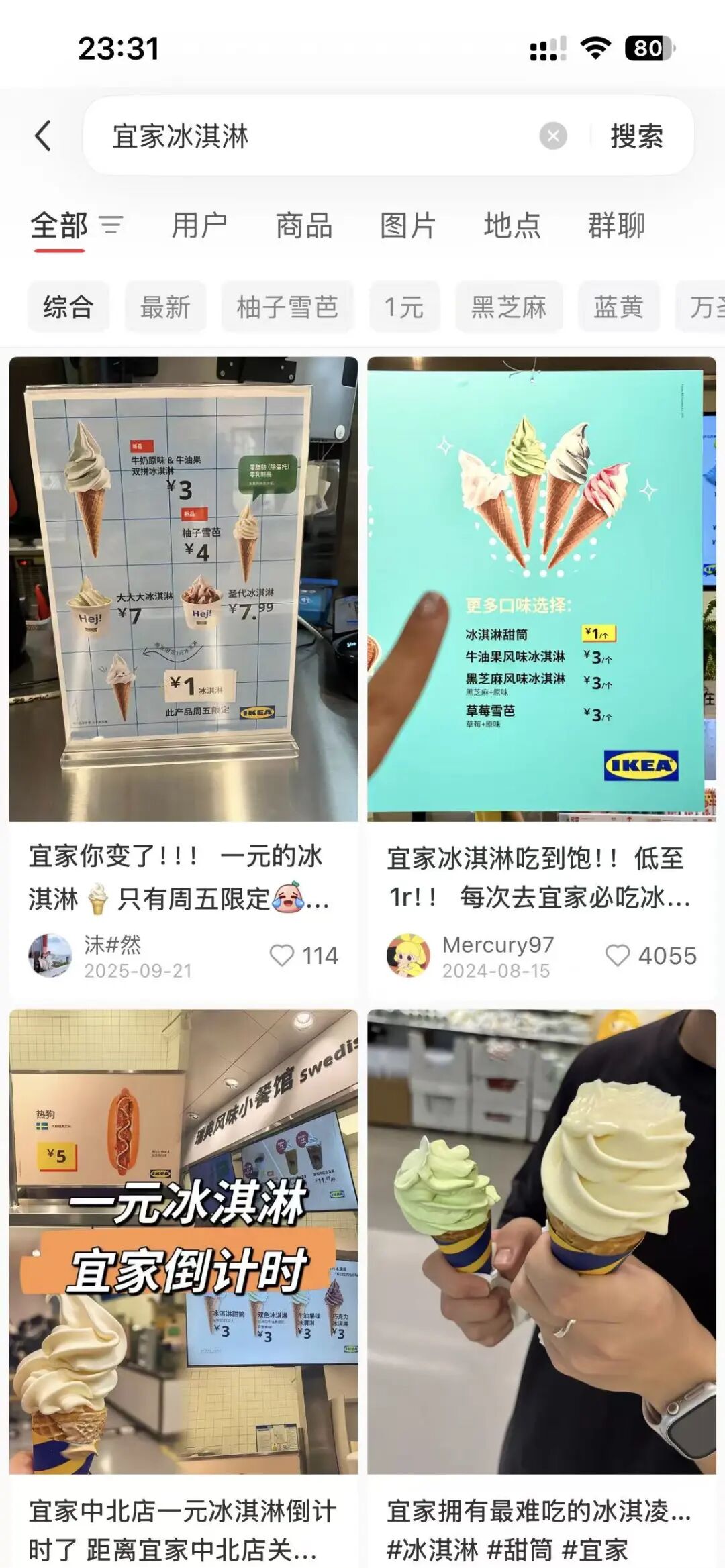 在小红书、抖音等平台中,围绕宜家的讨论,更多集中在 #有什么便宜好物值得淘# #哪些小件性价比高# #去一趟宜家怎么买最划算#,甚至包括冰淇淋、餐厅等体验性内容。这些内容为宜家带来了稳定而可观的流量,却也在无形中强化了它作为“高性价比卖场”“生活方式卖场”的认知。昔日的“家居梦想家”,似乎正在变成一个“百货淘货场”。