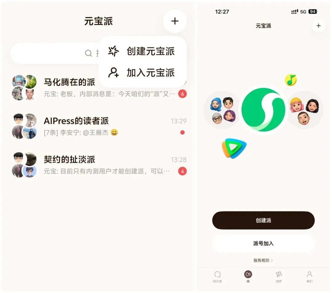 首先是在社交应用上拥有绝对地位的腾讯。1月26日,腾讯旗下AI助手“元宝”正式开启社交AI功能“元宝派”内测,马化腾透露,“元宝派”旨在打造一个AI与用户共同娱乐、协作的“社交空间”。目前,元宝APP首页已新增“派”专属入口,用户可以创建派、邀请他人或接受他人邀请加入派,与成员及元宝进行互动交流、发起活动等。其中,创建派的用户为“派主”,派内用户统称为“成员”,“元宝”为派内AI助手。