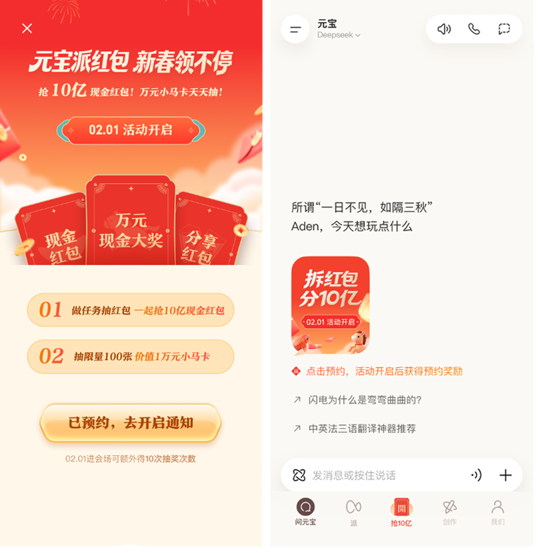之后,腾讯元宝加码投入AI红包,狂撒10亿元现金红包,腾讯董事会主席马化腾直言,“希望重现当年微信红包的盛况”。元宝的新春活动将于2月1日正式开启。目前正积极引导用户在App内点击预约卡片进入春节会场,提前预约的用户可以在2月1日活动开启当天,额外获得10次抽奖机会。