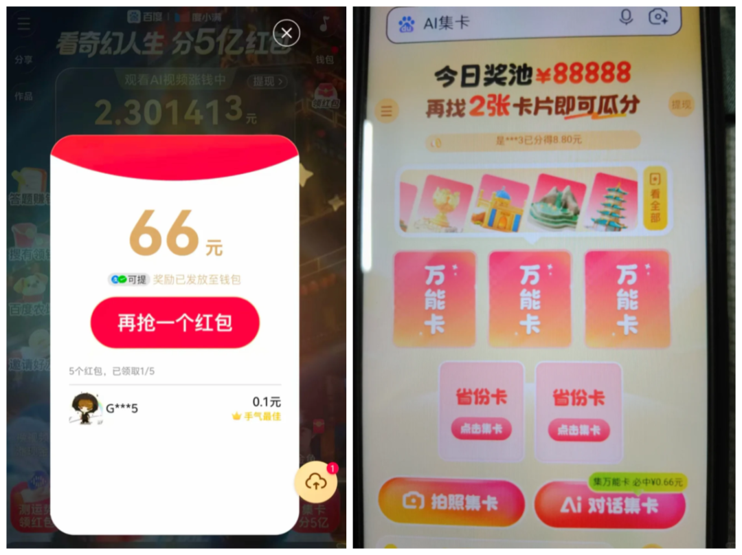 2026年,最早出手的是老牌互联网品牌——百度,狂撒5亿现金红包,时间从1月26日持续到3月12日。在AI的融入上,除了常规的集卡,一个是百度APP搜索“春节红包”,可以解锁近200款马年主题AI特效。只需要手指轻轻一点,即可一键生成自己主演的奇幻短片,从“马到成功”古装剧情到赛博朋克马术大片,应有尽有。