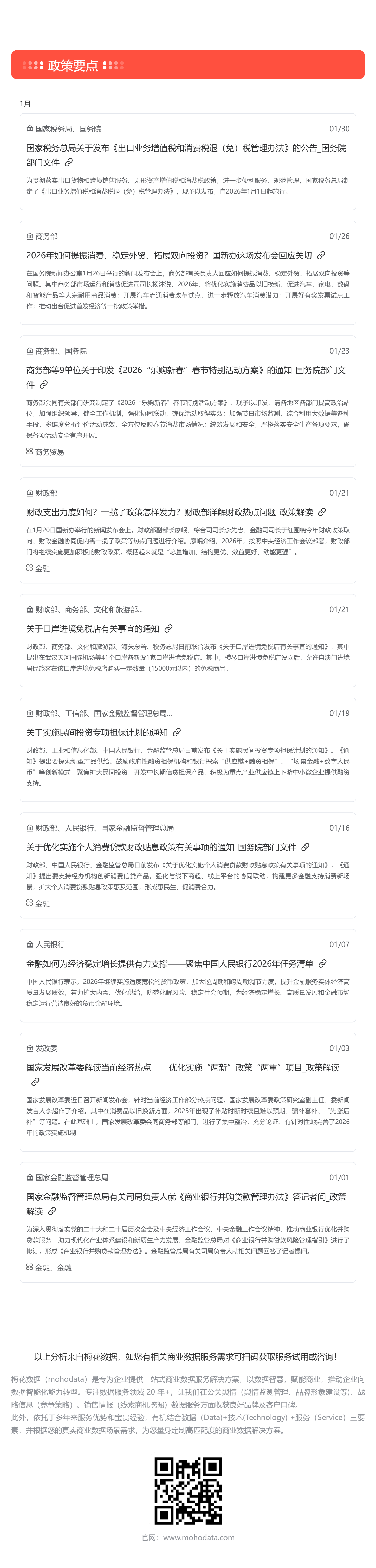 根据梅花数据舆情监测要政盘点统计,2026年一月份共收录重要环保政策信息共计60条,其中涉及进出口、个人消费贷款、银行并购等多个热点,建议重点关注《出口业务增值税和消费税退(免)税管理办法》、《商业银行并购贷款管理办法》等政策。