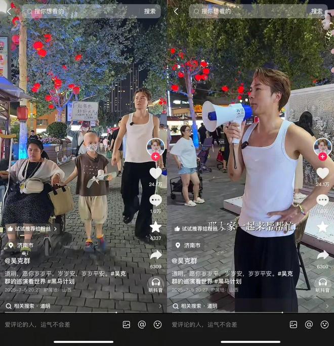 当然,除了B太,在抖音上,其实还有一堆网红,开始转型“做好事博主”,其中,吴克群算是最先“跑”出来的一个账号。