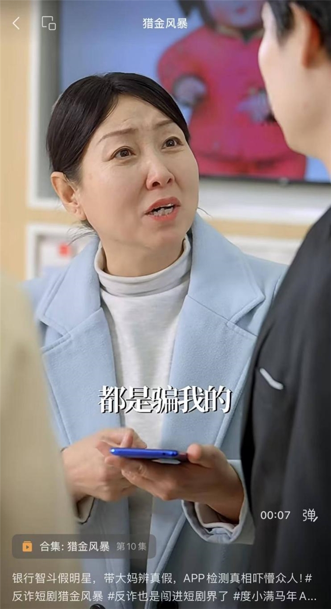 在短剧上,度小满视频号目前已发布20集短剧《猎金风暴》。与其他市面上颇受欢迎的短剧类似,《猎金风暴》的剧情同样扣人心弦、跌宕起伏。其在剧情推进过程中,原生化融入AI拟声税务诈骗、AI换脸直播加盟诈骗等内容,提升观剧者的反诈警惕性。