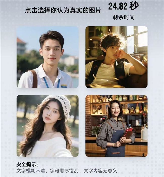在互动游戏“鉴真”中,玩家们能直观了解AI生成深度伪造内容的能力。它要求玩家在四份图片或视频中识别出唯一实拍的内容,而其他内容则为AI生成的虚假内容。由于大部分玩家并不能快速准确地甄别真伪,这让他们对诈骗者以假乱真的能力有了切身体会。