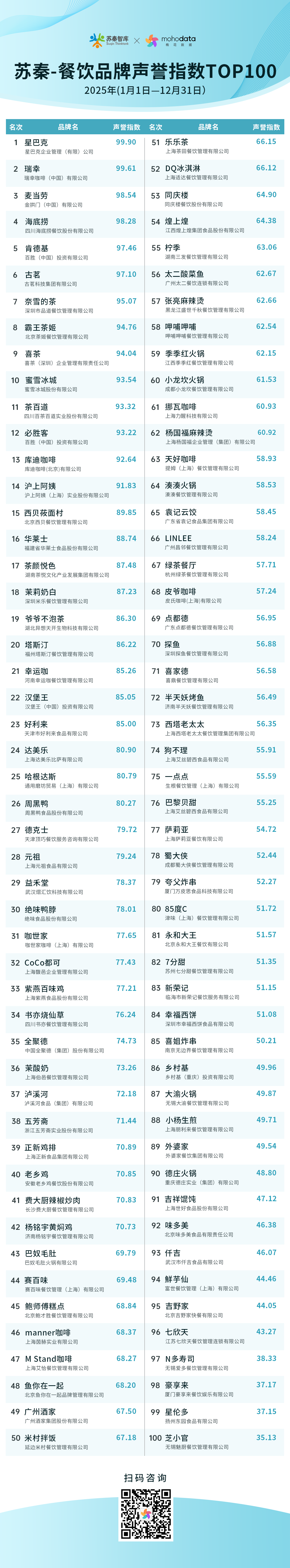 餐饮行业作为民生消费的核心赛道,直接关联亿万消费者的日常生活,其品牌声誉既是消费者选择的核心依据,也是企业可持续发展的关键资产。近日,苏秦声誉管理实验室联合梅花数据正式发布《2025年餐饮品牌声誉管理指数TOP100榜单》。榜单以品牌声量、品牌互动、品牌口碑、品牌损伤、品牌美誉五大核心维度为监测核心,覆盖咖啡、新茶饮、西式快餐、火锅、烧烤、中式正餐等全品类主流餐饮品牌,全面、精准捕捉2025年国内餐饮品牌的舆情动态与发展态势。榜单详情如下: