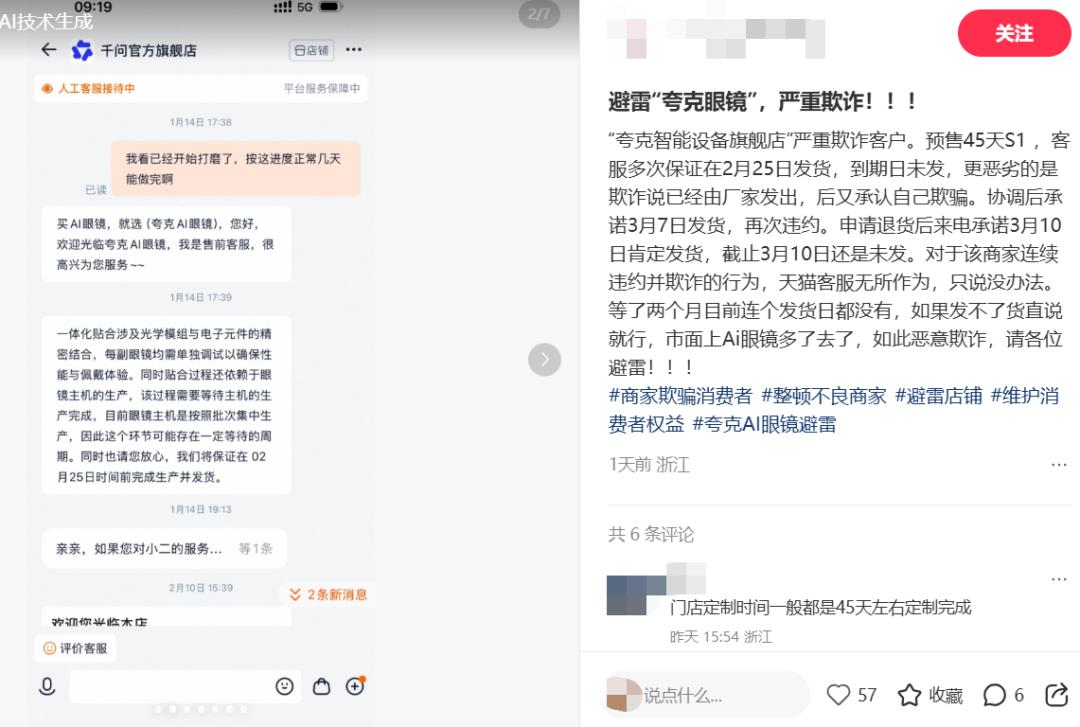 千问眼镜的上架,让一些已经下单了夸克眼镜的用户产生了“背刺”的感觉;“趣解商业”注意到,有此前下单夸克眼镜还没到货的用户还在犹豫是否要转头下单新发售的千问眼镜。