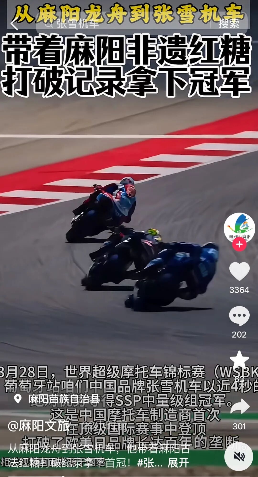 细心的网友发现,张雪居然把家乡特产也印在了车上做宣传。 张雪是湖南怀化麻阳人,比赛的 机车上印着“麻阳古法红糖”。