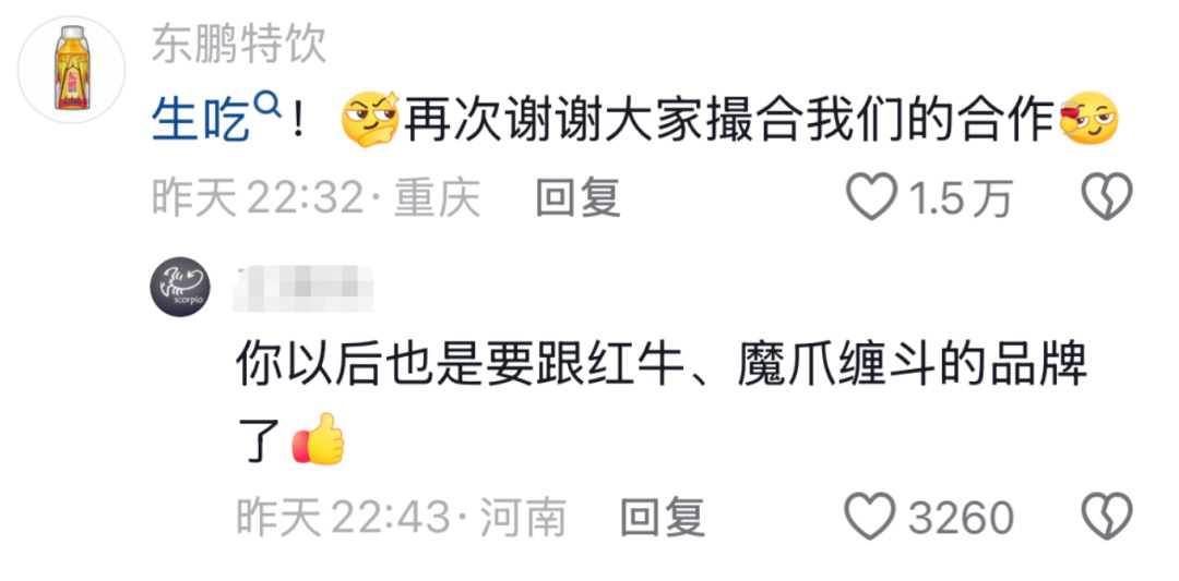 张雪机车夺冠后,东鹏特饮也在评论区感谢网友的撮合。