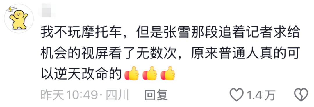 鬼火少年的赤诚,草根逆袭的叙事感动了无数网友。在这个到处劝人躺平的时代,对摩托车充满热爱的张雪让网友重新感受到了拼搏和激情。