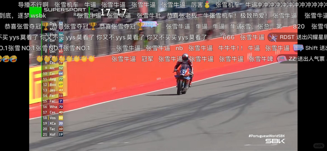 国内的摩托车迷们一阵热血欢呼,赛事直播弹幕上都在刷“恭喜张雪夺冠”。