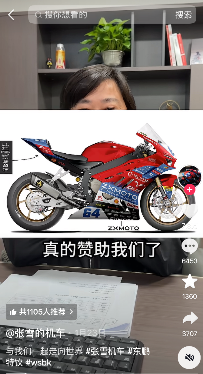 与张雪机车一同火了的还有东鹏特饮。张雪曾在抖音账号发了个寻找赞助商的视频,网友联系到东鹏特饮,撮合了双方的合作。