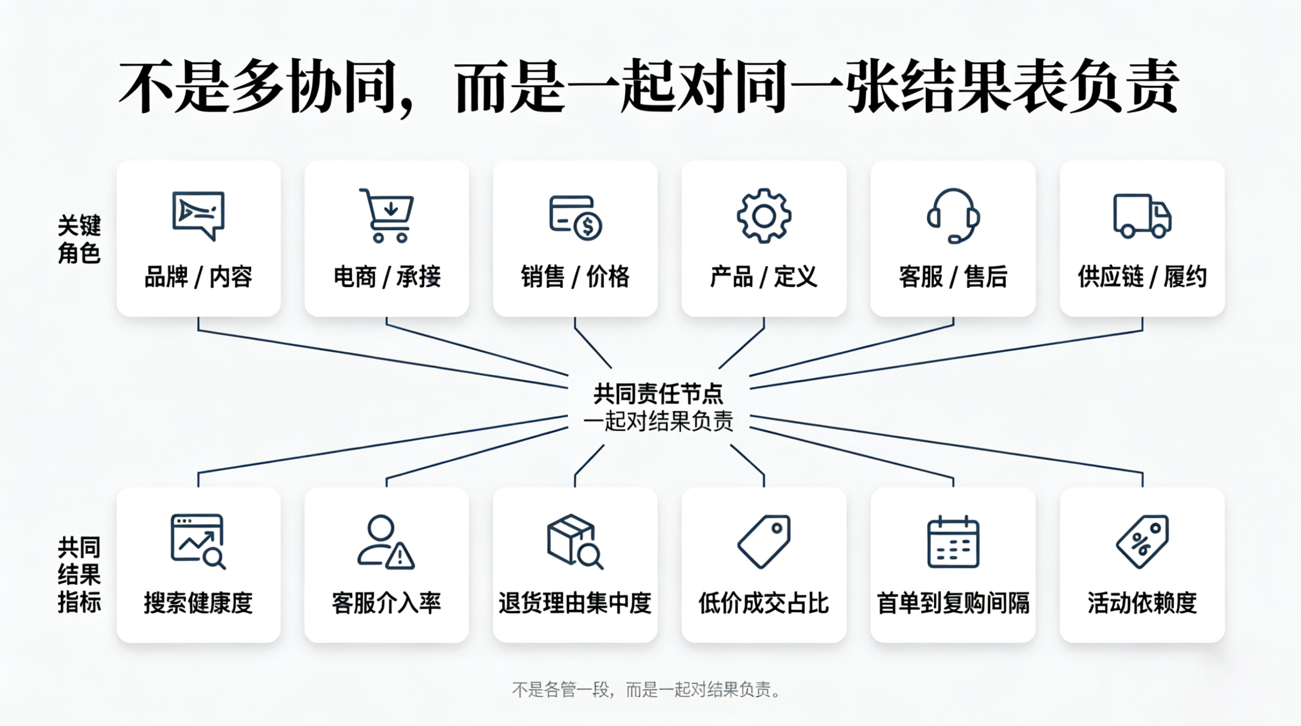 所以第一层,根本不叫协同,叫先把自己手上的这些事接成一条线。前面种草说一套,搜索承接说一套,详情页又是一套,客服话术第四套,这不是组织太复杂,是管理没拧起来。你前面讲了什么,用户搜到什么,页面接住什么,客服复述什么,会员后面怎么跟,这得是一条线。很多问题不是难在不会做,是难在每个人都做了一点,最后拼不起来。