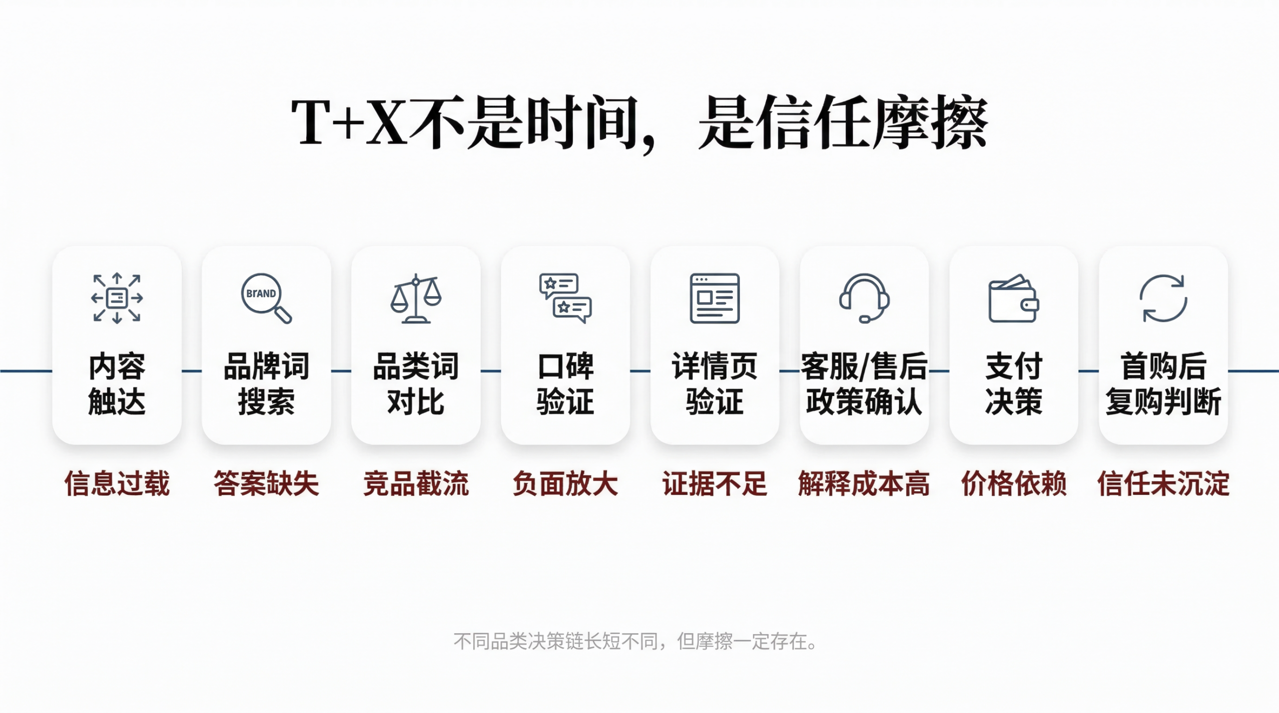 因为用户不是慢一点下单这么简单。他是在这段时间里一边走,一边检查你,一边给你减分。搜索没接住,减分;页面说重了,减分;客服话术和页面上的承诺对不上,减分;退货理由集中在几个点上,减分;第一次成交以后还得靠更狠的折扣把人拉回来,继续减分。