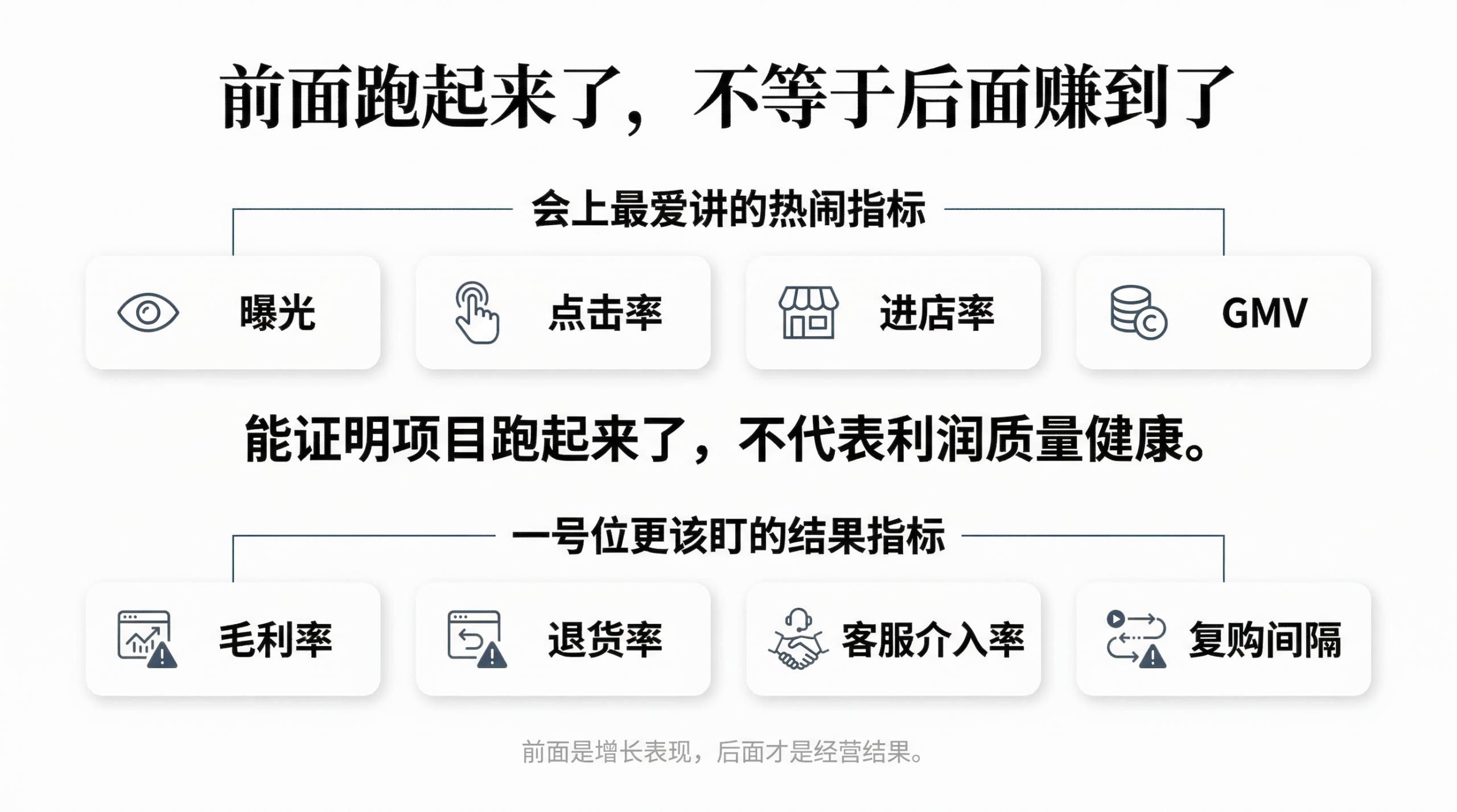 为什么我一定要说“一号位”?因为坐这个位置和不坐这个位置,脑子里算的根本不是同一笔账。没当过的时候,你会觉得这只是几处数据没对上。真坐上去,月会开到一半,大家还在讲曝光、讲点击、讲转化,你脑子里已经在算另一笔账:前面拉进来的人,后面到底接住了没有;今天看着过关的GMV,月底把返利、补贴和售后摊进去还剩多少;客服那边那几个高频问题,什么时候会开始反噬投放。到那个位置,你很难再用“整体还行”这四个字安慰自己。不是没有做事,而是做了很多事以后,还是越来越难确认,企业到底是更容易赚钱了,还是只是更努力地解释自己为什么还没赚到钱。