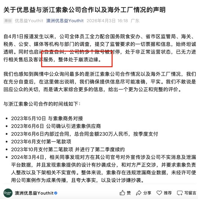 从涉事企业来看,几乎是“毁灭”的。昨天,优思益发了第二份声明,虽然官方调查还未有任何结论,但公司已“整体处于崩溃边缘。”
