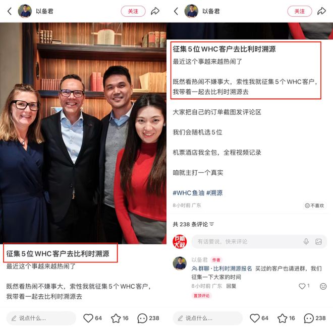 WHC品牌中国区负责人张晓忠在其小红书账号@以备君 上,直接“公开征集5位用户去比利时溯源”!