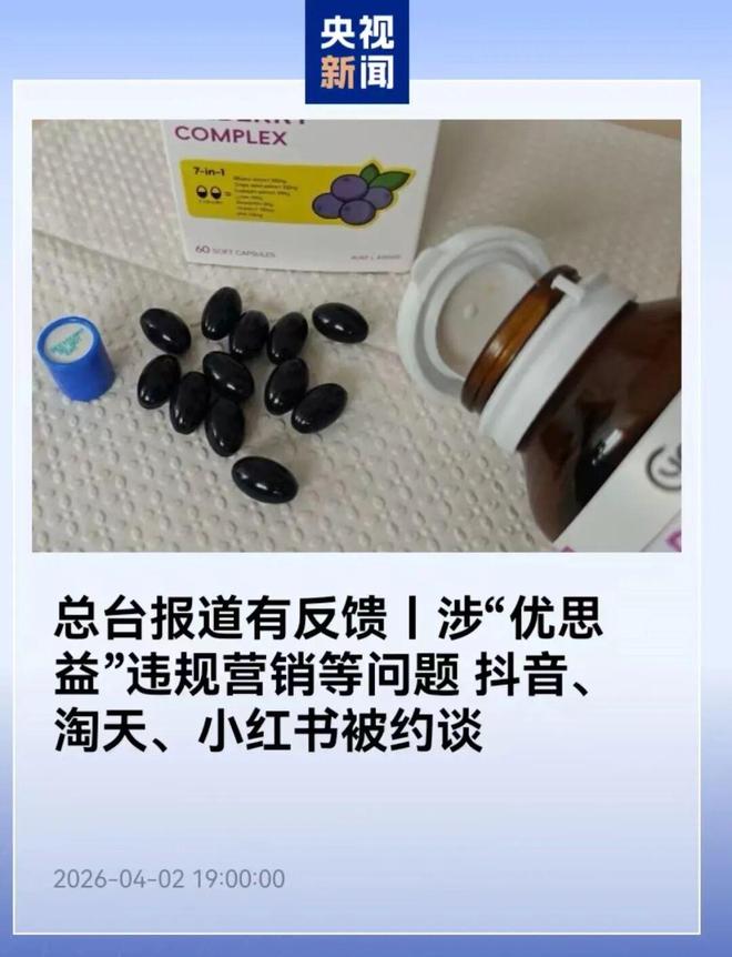 4月2日,国务院食安办、市场监管总局、海关总署对总台报道的跨境电商进口“优思益”保健品违规营销等问题,涉及的抖音、淘天、小红书3家平台,进行约谈。