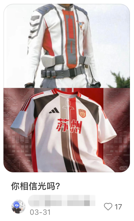 不少网友表示扬州队的客场球衣有点眼熟,像《迪迦奥特曼》里胜利队的队服,并且胸前居然有两条“跑道”。