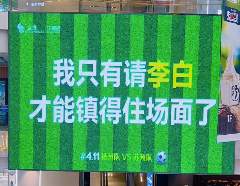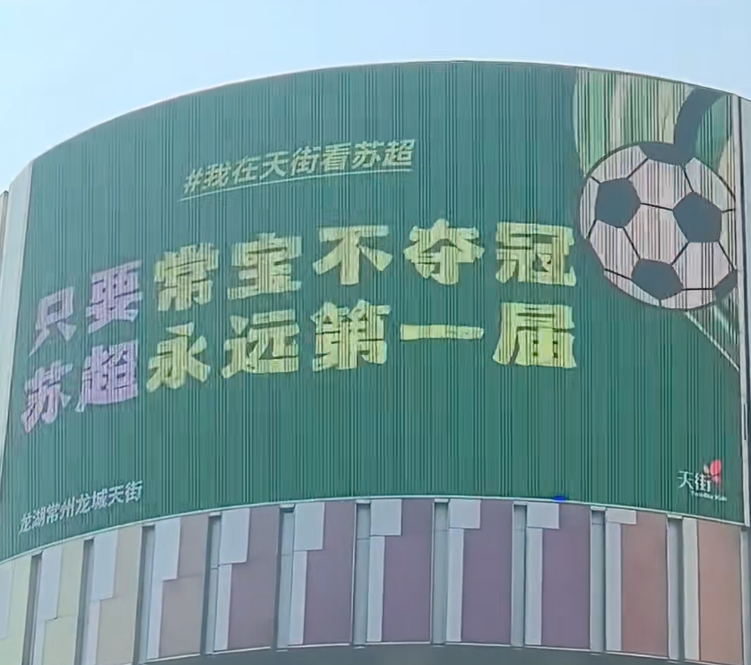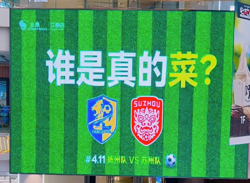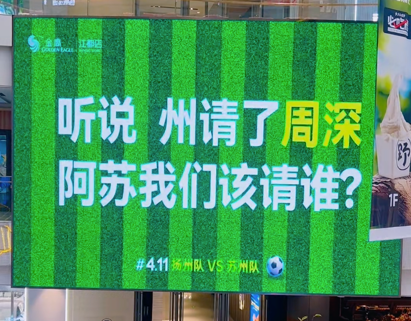 最近,江苏各地的商场开始老活新整,借势4月11日开赛 的苏超,在大屏上创作“赛前垃圾话”,依旧挑事,不正经但很上头,把“比赛第一,友谊第十四”的精神进行到底。