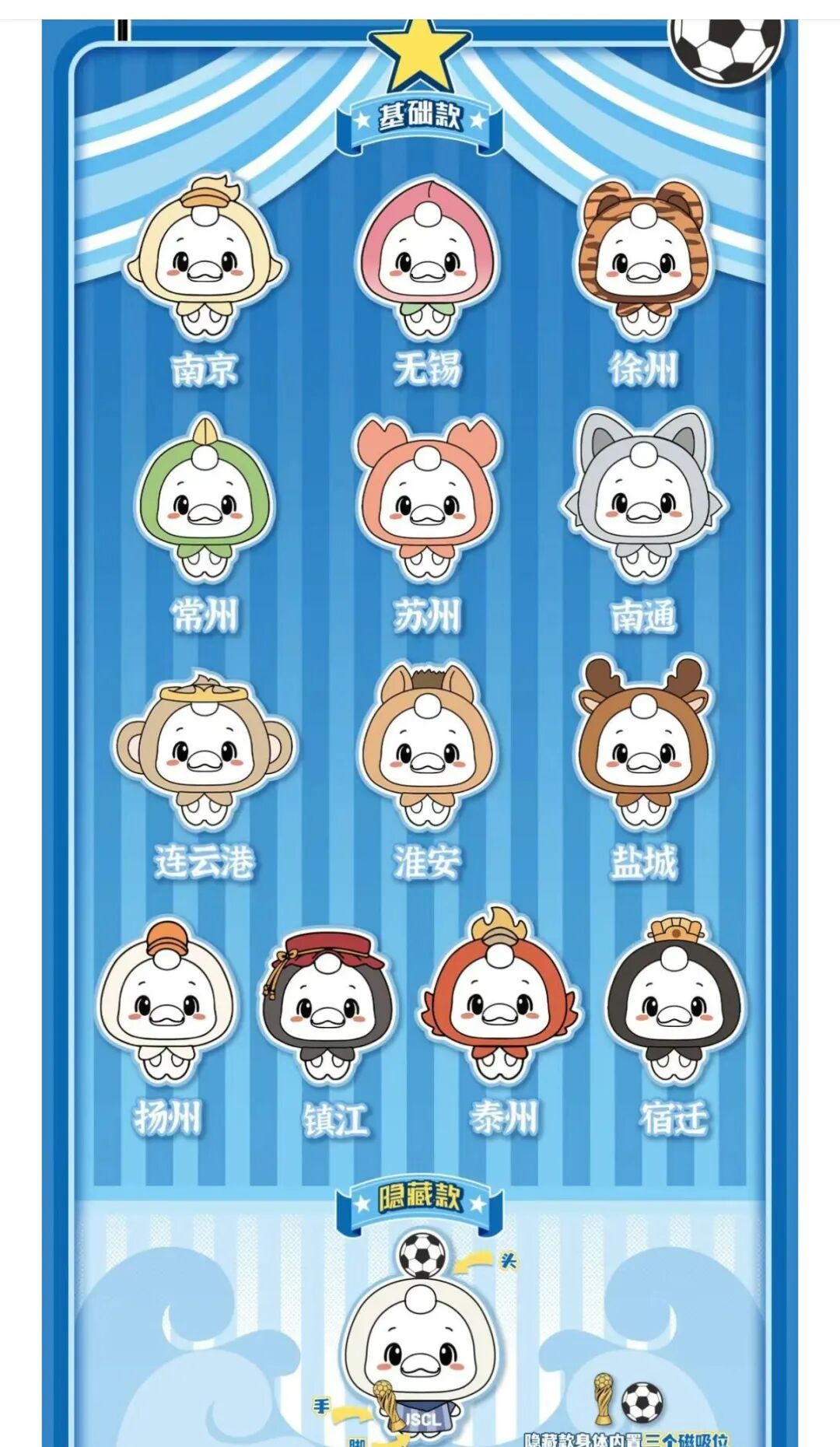 与此同时,苏超的吉祥物也吸引了不少网友的讨论。官方周边围绕 苏超吉祥物“苏嘟嘟”设计,产品由 苏超 官方供应商Suplay潮玩推出。苏嘟嘟以江豚为原型,延伸出十三款设计,对应十三太保。吉祥物毛绒玩偶盲盒中还有一个隐藏款,所有玩偶都配有一只磁吸式的足球配件——可以贴在苏嘟嘟的头顶和脚上,可玩性较强。第一轮盲盒已于3月25日售罄,下一轮将在揭幕赛当天开启。