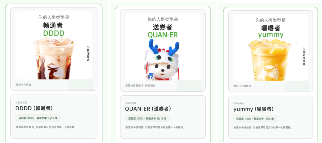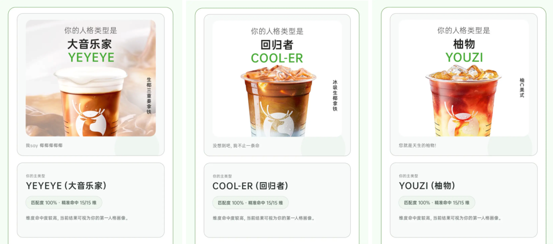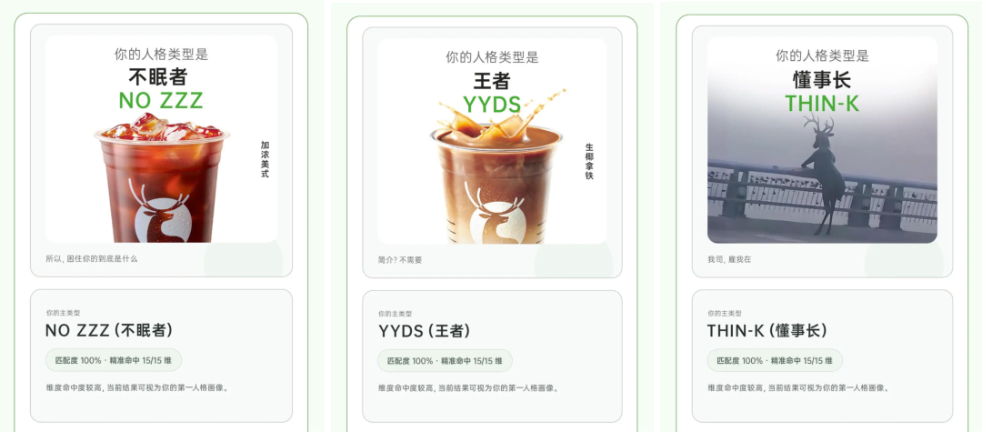 还有瑞幸咖啡的RUTI型人格,生椰拿铁是“王者YYDS”,柚C美式是“柚物YOUZI”