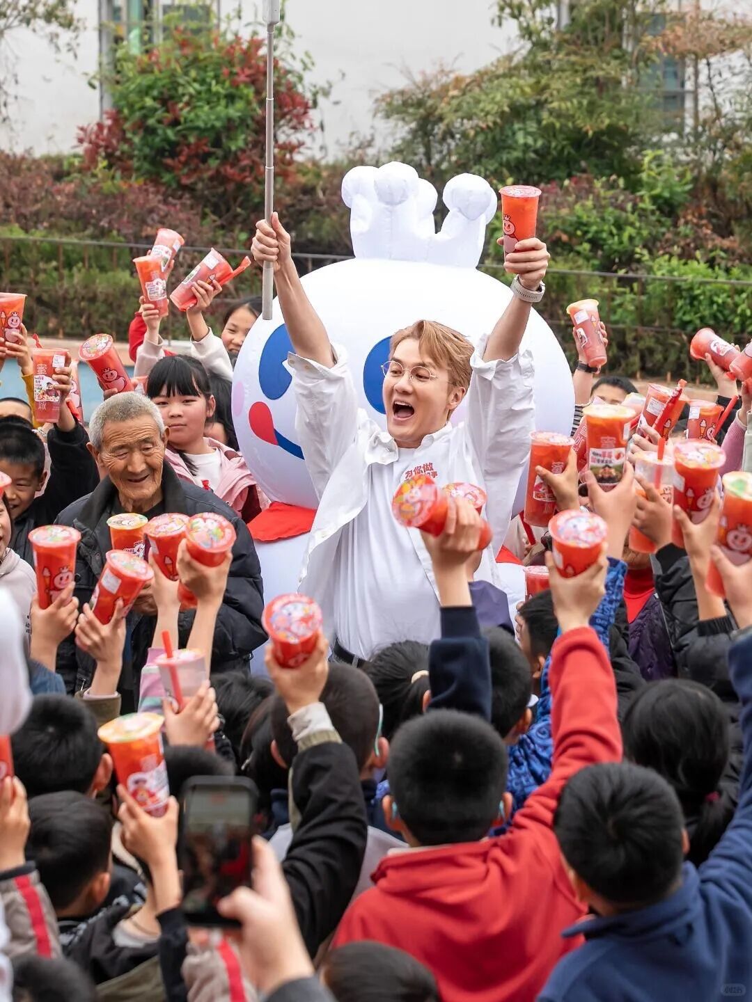 不仅如此,吴克群和雪王还带着草莓系列饮品和雪王周边,来到当地较贫困的学校里,为小朋友们送上一点甜。