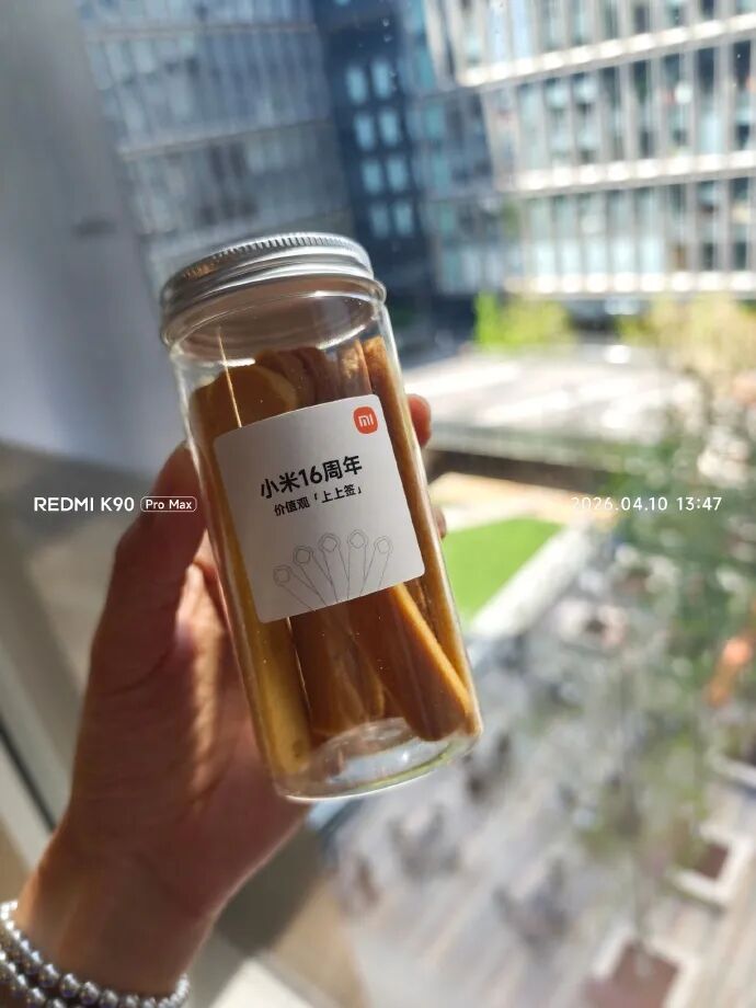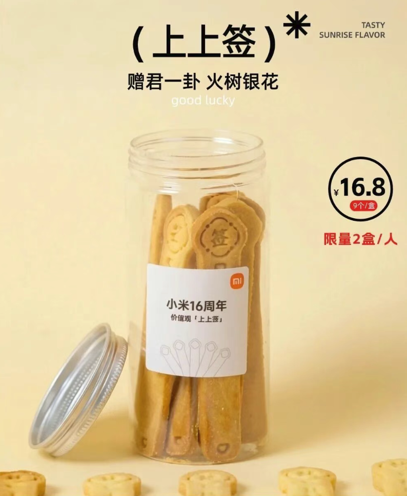 这几根饼干条也不普通,这是小米的价值观饼干“上上签”,顾名思义,饼干被设计成了签条的样子,上面刻有“真诚热爱”“坚韧热爱”等字样。