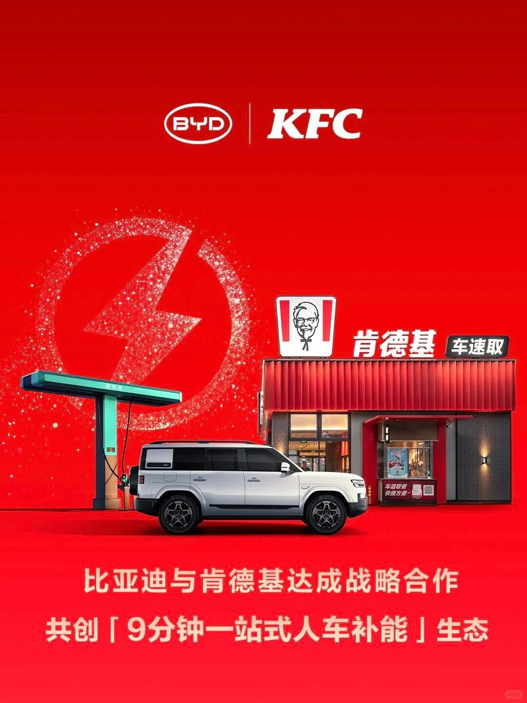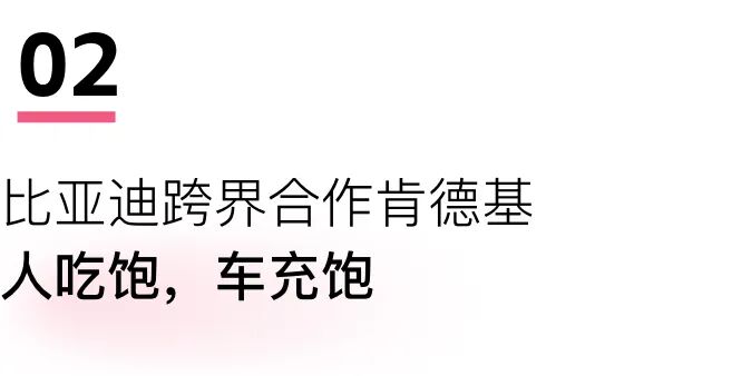 最近,比亚迪宣布与肯德基达成战略合作。用户在车机上点单肯德基,根据导航抵达顺路的店,在专属车道取餐不用下车排队,还可以在肯德基门店享受闪充服务。9分钟,汉堡吃完了,电也充好了~