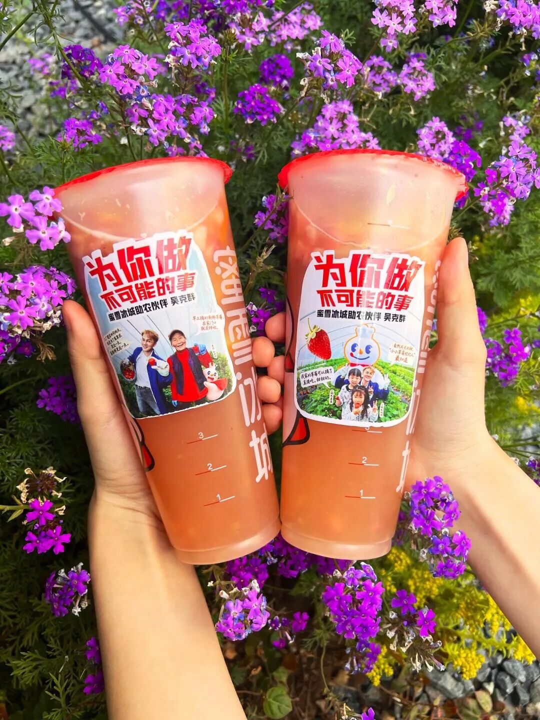 推出了草莓啵啵、草莓摇摇奶昔等系列产品。官方还设计了多款杯贴,印有品牌助农伙伴吴克群、果农老人和孩子们,以及助农宣传语“为你做不可能的事”。
