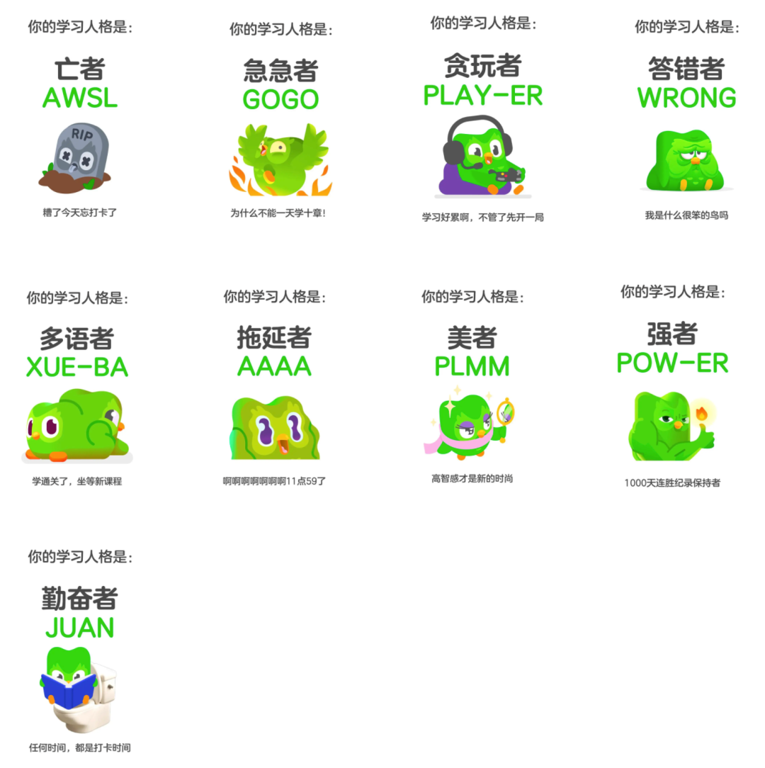 有品牌借势SBTI热点,比如多邻国做了个学习人格,将用户使用多邻国APP学习的状态分类: