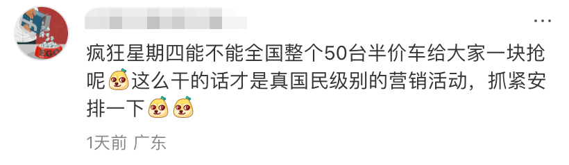 对于这份合作,有网友表示,疯狂星期四能不能全国整个半价车活动