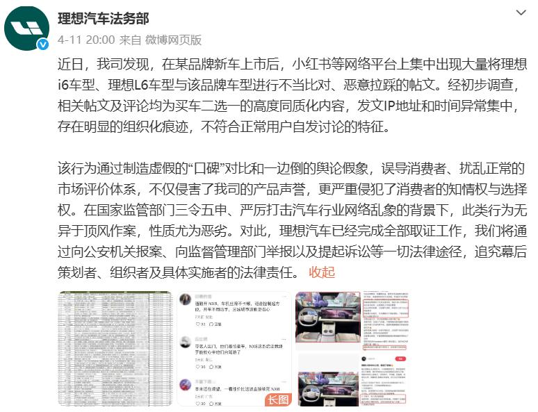 4月11日20时,理想汽车法务部通过微博发文称,某品牌新车上市后,网络平台上集中出现大量将理想i6车型、理想L6车型与该品牌车型进行不当比对、恶意拉踩的帖文。理想汽车已经完成全部取证工作,将通过向公安机关报案、向监督管理部门举报以及提起诉讼等一切法律途径,追究幕后策划者、组织者及具体实施者的法律责任。该条微博还附上了部分帖文列表。