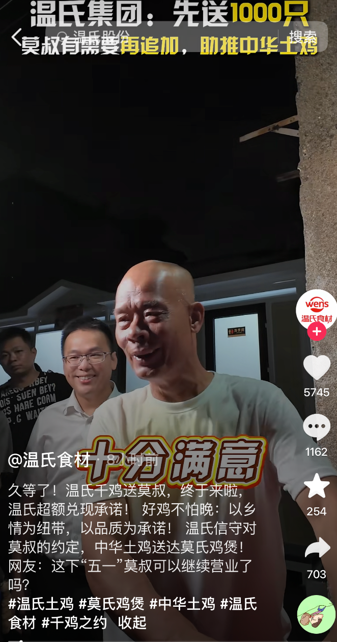 老莫自家的散养鸡不够吃了,温氏集团官宣送鸡。4月15日,第一波土鸡终于送到,品牌方借势收获了一大波曝光。