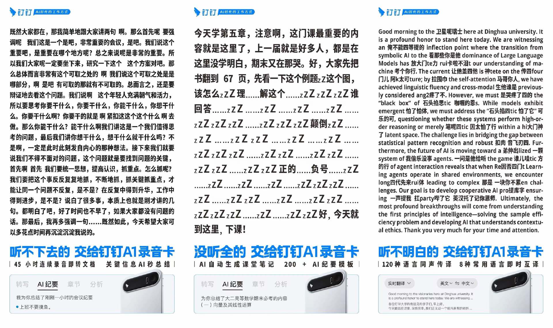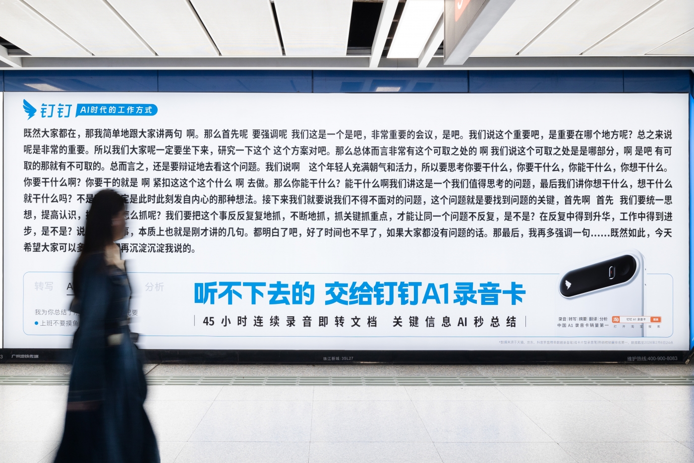 开工开学季,钉钉在各大城市地铁站投放了一组「天书文学」户外广告。满屏密密麻麻的文字,远看让人头晕,近看更是扎心,真实还原了我们「信息过载」的荒诞日常。那些记不完的会议、听不懂的外语、理解不了的话外音......直击当代人工作学习中的痛点,顺势引出钉钉 A1 录音卡的硬核功能,轻松完成了从情绪共鸣到产品认知的丝滑转化。