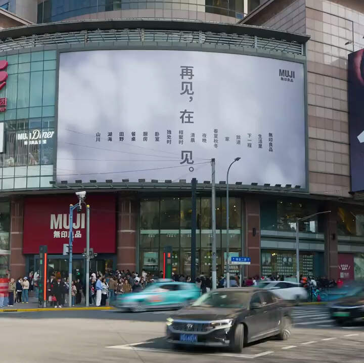 坐落于淮海路的 MUJI 中国首家旗舰店,官宣将于3月底正式闭店。品牌在店铺的外墙挂上了一幅告别海报,以「再见」与「在....见」的双关,将离别的不舍转化为对重逢的期许,也让品牌记忆在温柔的文字中自然流淌。街边的树影落在素净的海报上,晕染出安宁的日常光景,就像MUJI 多年来的陪伴,如呼吸一般,早已融入了生活的肌理。