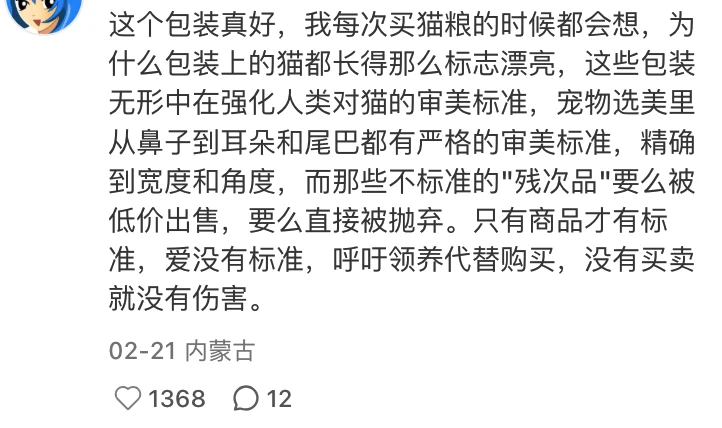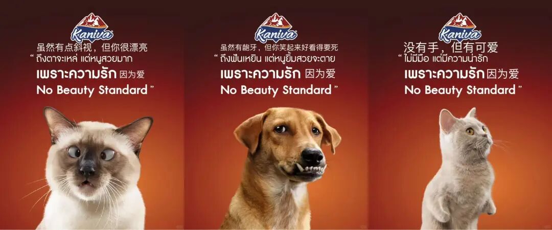 有时候我们得承认,这个世界的审美是非常霸权的。宠物广告或包装上,我们更多看到的被展示的宠物是血统纯正、长相标准的孩子,大家所推崇的也是一种「美丽」的爱,无形中我们也许正接受着某种隐形认知:只有长得好看的宠物才值得被宠爱。